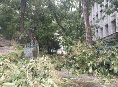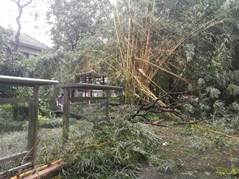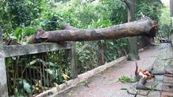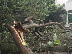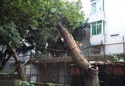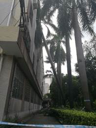受此次台风影响,Bwin必赢中国官网二十七棵大树风倒风折,歪歪斜斜的中小树木不计其数。图书馆前的大王椰,几千斤的份量,树高15米,根部断裂,躺在墙上。幼儿园的大树根部断裂,压在幼儿园瓦房上面。运动场围墙边大树风倒风折,办公大楼东边运动场以及办公大楼南边,五层楼高度的柚木枝条折断无数,通道堵塞……