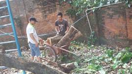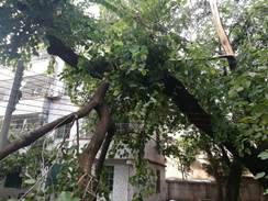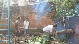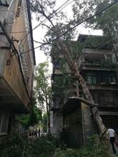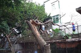 (清理位于国际楼保安宿舍屋顶大树压到保安宿舍的屋瓦、电线、网络线等的一系列工作,消除了安全隐患。)