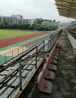 图3.看台栏杆部分锈蚀损坏(修缮前) 图4.看台栏杆刷漆翻新竣工效果(修缮后)