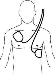 2.从AED背面取出电极片,按照电极片上的图片所示,准确摆放电极片。放置电极之前,确保剥掉其内衬垫,贴好电极片后插入电极片插头。
