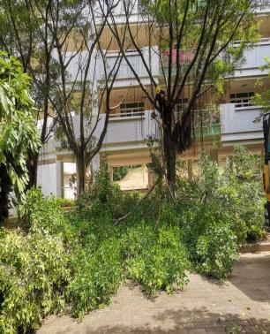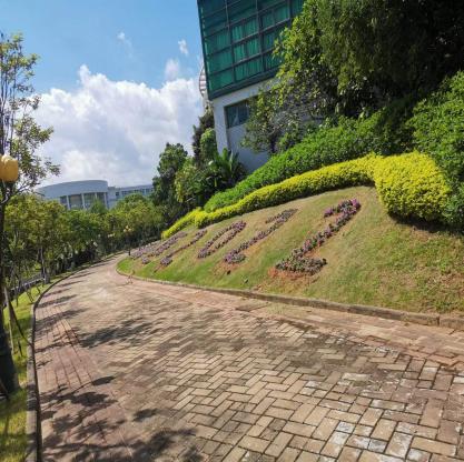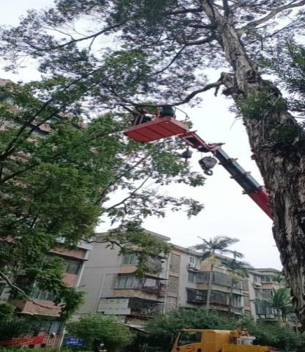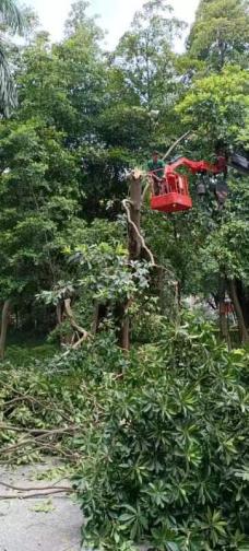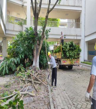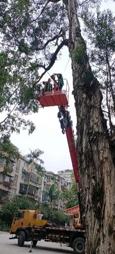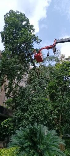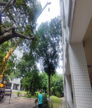 为保证校园高大乔木树形美观,消除高枝、枯枝带来的安全隐患,增强抵御台风、暴雨等恶劣天气的能力,两校区于暑期组织开展高大乔木树枝修剪,两校区共修剪了约300棵树木。