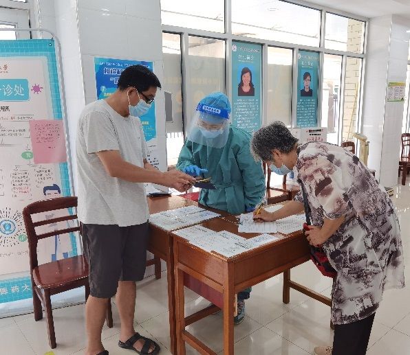 门诊预检分诊是做好防疫工作的基础。分诊人员不畏炎热身穿隔离衣,坚守于工作岗位。查看就诊人员的健康申报卡及行程码,遇到不懂手机操作的老人家,不厌其烦,热心帮助,对分诊工作毫不松懈。