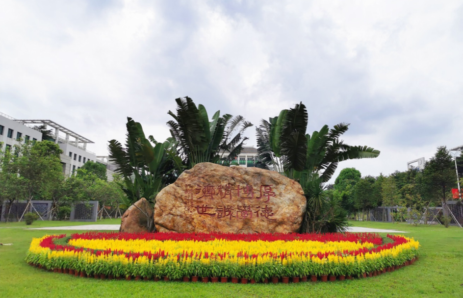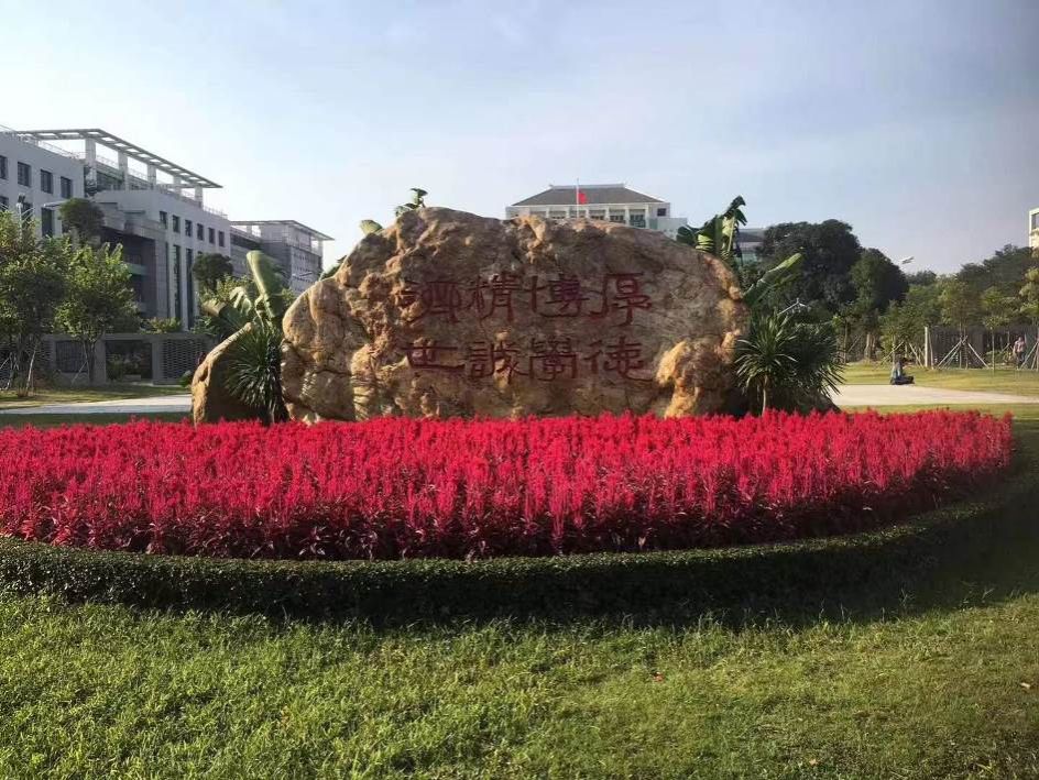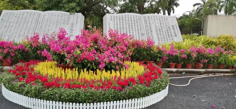 叶师傅用花朵装点校训石、正门口