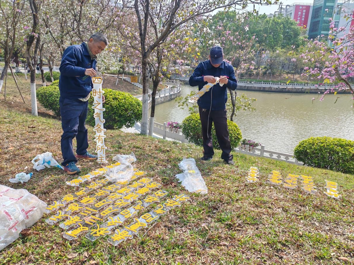 为给师生们带来这份惊喜,总务后勤部前期对河边树木进行了细致勘察,结合树木分布和校园整体规划,确定灯牌的悬挂位置。为确保灯牌内容准确、丰富且具有科普性,查阅中医药典籍资料,邀请专业的中医药老师把关审核,让每一块灯牌都成为传播中医药知识的可靠窗口。灯牌采用高效太阳能板供电,无需外接电源,绿色节能环保,白天蓄电、夜间发光,既降低用电成本,又减少碳排放。